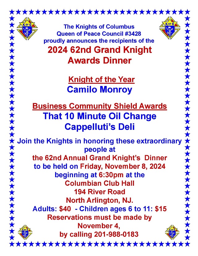 October 28, 2024The Knights of Columbus, Queen of Peace Council #3428, invites you to the 62nd Grand Knight Awards Dinner to celebrate outstanding contributions to our community.