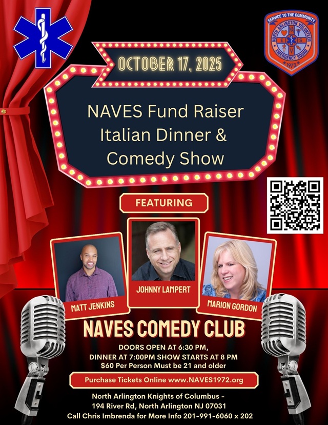 August 22, 2025Support the North Arlington Volunteer Emergency Squad (NAVES) while enjoying a night of laughter, food, and fun at this exciting fundraiser event!